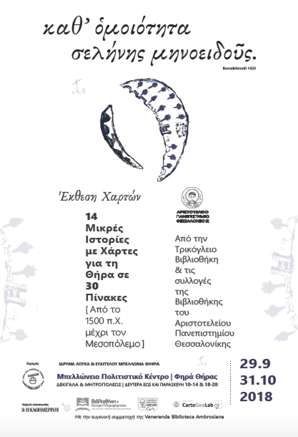 Στα Φηρά, στους εκθεσιακούς χώρους του Mπελλώνειου Πολιτιστικού Κέντρου, το Σάββατο 29 Σεπτεμβρίου ο Ηρόδοτος συναντά τον φραγκισκανό μοναχό Κριστόφορο Μπουντελμόντι με το παλαιότερο βιβλίο των νήσων του Αρχιπελάγους (1420), οι υποχθόνιες δυνάμεις της Φύσης ζωντανεύουν ψηφιακά και μεταβάλλουν το αρχικό στρογγυλό σχήμα της νήσου σε μηνοειδές, ο άραβας Αλ Ιδρίζι παρουσιάζει τη šantari ωοειδή και πεπλατυσμένη και δείχνει πως ο βορράς έχει κατεύθυνση προς τα κάτω και ένας Ολλανδός που χαρτογραφούσε τη γη χωρίς να έχει ταξιδέψει ποτέ συναντά τον Μανόλη Τριανταφυλλίδη, που του συστήνεται, όχι ως φιλόλογος, αλλά ως φοιτητής φυσικομαθηματικής σχολής! Δεκατέσσερις μικρές ιστορίες -λιγότερο γνωστές έως και άγνωστες μέχρι σήμερα- συνθέτουν μέσα από 30 πίνακες και χάρτες ένα σπονδυλωτό αφήγημα με τον γενικό τίτλο: «Καθ’ ὁμοιότητα σελήνης μηνοειδοῦς». Η σπειροειδής διάταξη των εκθεμάτων ενισχύει τον διαδραστικό χαρακτήρα της έκθεσης και την αίσθηση του επισκέπτη πως ταξιδεύει στον χωροχρόνο.