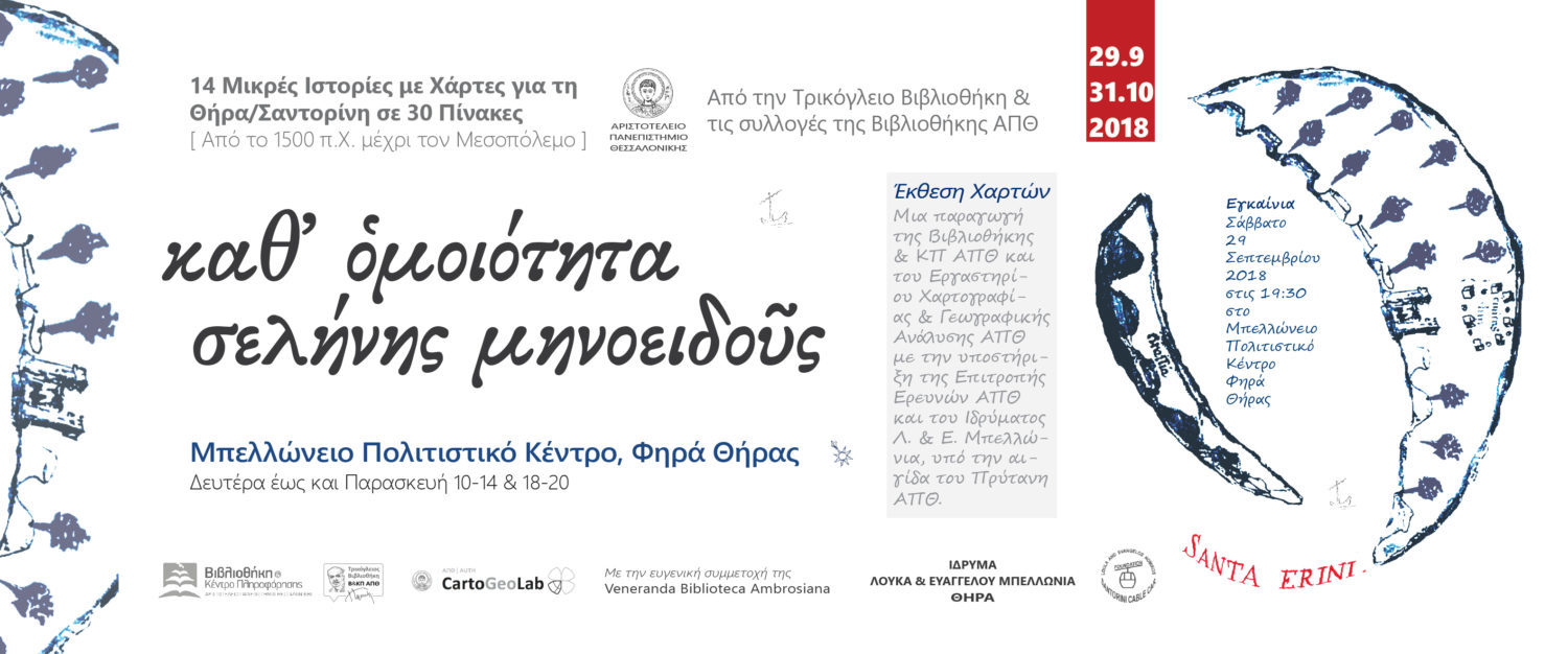 «Όταν το καράβι θα φύγει, την επαύριον, απ’ τη Σαντορίνη, όλα γίνονται απίθανα και φανταστικά», γράφει ο Ηλίας Βενέζης στο διήγημα «Άνεμοι» (1944) για το νοτιότερο νησί των Κυκλάδων. Το Αριστοτέλειο Πανεπιστήμιο Θεσσαλονίκης (ΑΠΘ) «φορτώνει» μοναδικά τεκμήρια από τη συλλογή των σπανίων της Βιβλιοθήκης του (ΒΚΠ-ΑΠΘ) και σαλπάρει για τη Σαντορίνη, προκειμένου να πάρει τους επισκέπτες και κατοίκους του νησιού συνοδοιπόρους σε ένα ταξίδι με χάρτες σε τόπους και ουτοπίες της νήσου Θήρας, της -κατά τον Léonce Élie de Beaumont- «… σημαντικότερης και διδακτικότερης νήσου, εξ όσων υπάρχουν επί της γης…».
