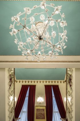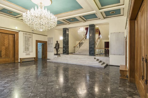 Κεντρική θέση στο Μέγαρο της ΕΣΤΙΑΣ, καταλαμβάνει η μεγαλοπρεπής Αίθουσα εκδηλώσεων, τα διακοσμητικά στοιχεία της οποίας ανέλαβε ο σκηνογράφος και διακοσμητής του Εθνικού Θεάτρου, Μάριος Αγγελόπουλος. Ο ίδιος ανέλαβε και τη διακόσμηση της Κεντρικής Κλίμακας του Μνημειώδους Μεγάρου, το οποίο υπήρξε το επιστέγασμα του λαμπρού εθνωφελούς και κοινωφελούς έργου της 45χρονης τότε ΕΣΤΙΑΣ.