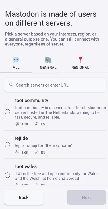 Η έναρξη ενός λογαριασμού στο Mastodon είναι απλή. Αφού κάνετε κλικ στο κουμπί “Ξεκινήστε”, η εφαρμογή ζητά από τους χρήστες να επιλέξουν τους διακομιστές στους οποίους θα ήθελαν να ενταχθούν. Παρόλο που το Mastodon υπάρχει εδώ και έξι χρόνια, μέχρι στιγμής, η βάση χρηστών είναι αρκετά μικρή, με περίπου 600.000+ ενεργούς χρήστες (οι περισσότεροι από τους οποίους, όπως φαίνεται, είναι Ευρωπαίοι). Οι διακομιστές μπορούν να είναι περιφερειακοί, βασισμένοι σε χόμπι ή σε εργασία.