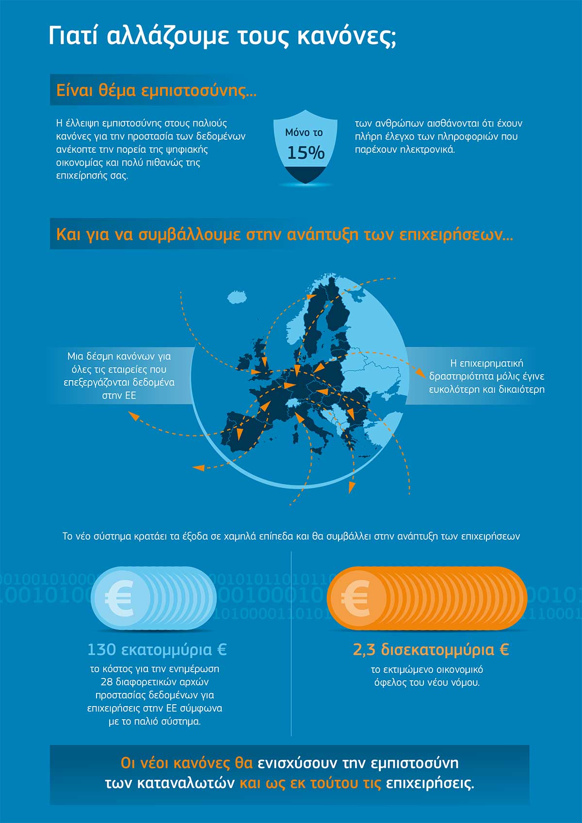 Δύο είναι οι λόγοι που οδήγησαν στη δημιουργία αυτού του κανονισμού. Ο πρώτος είναι οι ίδιοι οι πολίτες να έχουν τον έλεγχο των δεδομένων τους. Οι εταιρείες δεν θα μπορούν πλέον να συλλέγουν οποιαδήποτε πληροφορία επιθυμούν, αν δεν συντρέχει σοβαρός λόγος.