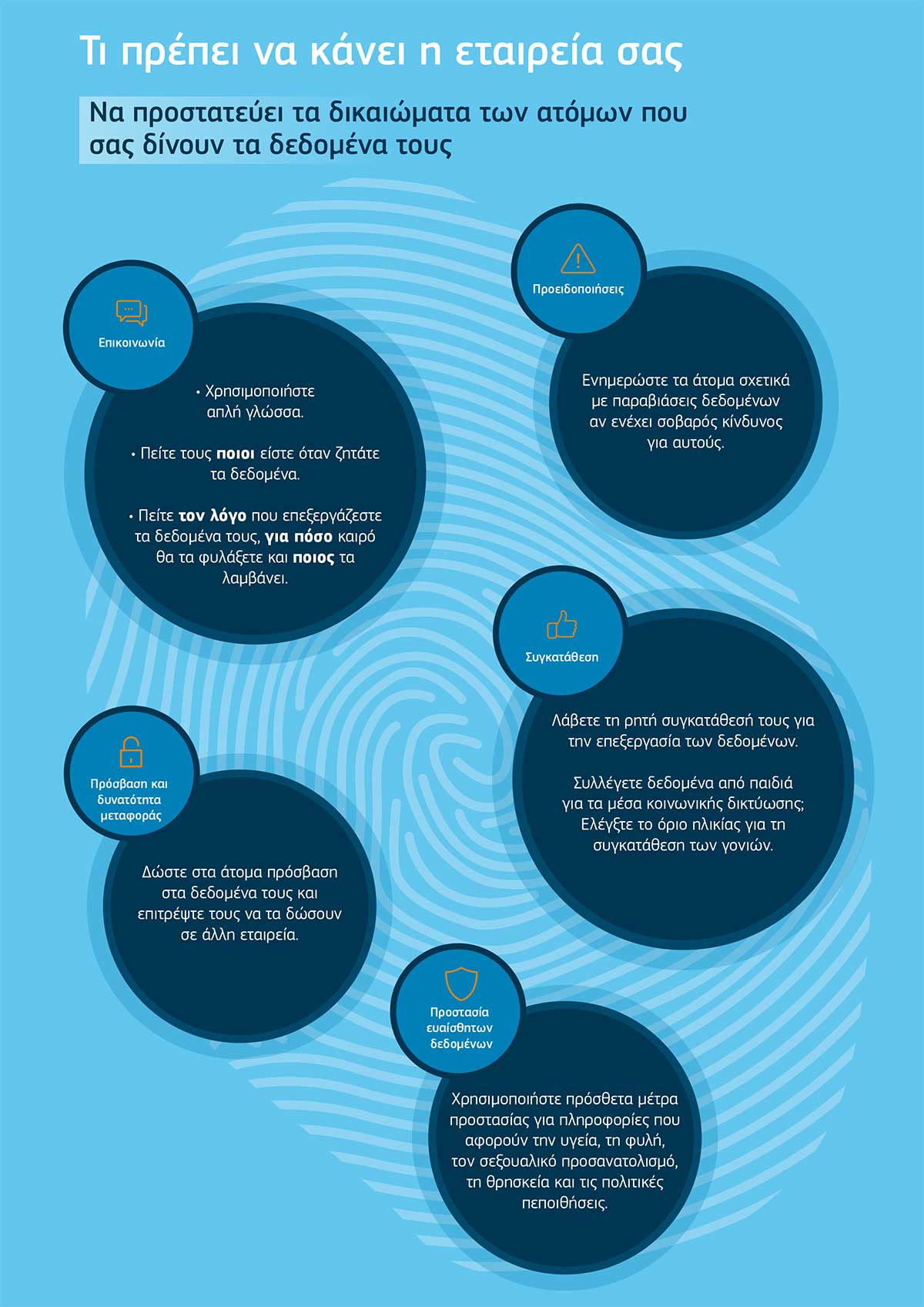 Ο κανονισμός GDPR δίνει στους πολίτες της ΕΕ νέα δικαιώματα σε σχέση με τα προσωπικά τους δεδομένα, όπως, μεταξύ άλλων, το δικαίωμα να αποσύρουν τη συγκατάθεσή τους, καθώς και ευκολότερη πρόσβαση στα δεδομένα που τους ανήκουν. Υποχρεώνει τις επιχειρήσεις να αναλάβουν μεγαλύτερη ευθύνη για τα δεδομένα χρηστών τα οποία συλλέγουν και να εξασφαλίσουν ότι κάνουν ό,τι καλύτερο μπορούν για την προστασία των δεδομένων αυτών.