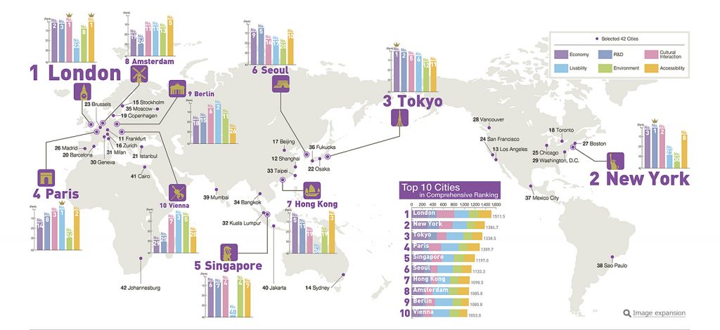 Φέτος, οι τρεις πρώτες πόλεις – το Λονδίνο, η Νέα Υόρκη και το Τόκιο, διατήρησαν τις θέσεις τους, με το Λονδίνο να παραμένει πρώτο για έκτη χρονιά. Το Τόκιο, το οποίο διεκδίκησε για πρώτη φορά πέρυσι τη θέση 3, βελτίωσε τις βαθμολογίες του στον τομέα της Πολιτιστικής Αλληλεπίδρασης, κλείνοντας το κενό με τη Νέα Υόρκη. Το Παρίσι παρουσίασε σημαντική πτώση στην κατάταξή του στην κατηγορία “Διαβίωση”, λόγω κυρίως των πρόσφατων τρομοκρατικών επιθέσεων, αλλά η πόλη υποδοχής των Ολυμπιακών και Παραολυμπιακών Αγώνων του 2024 αναμένεται να έχει ανοδική πορεία τα επόμενα χρόνια.