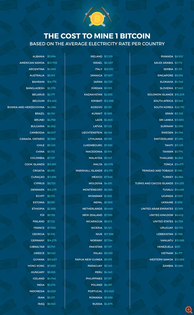 Η εταιρεία Elite Fixtures προχώρησε σε μία έρευνα ανά τον κόσμο σχετικά με τη μέση τιμή του ηλεκτρικού ρεύματος και συνέταξε έναν πίνακα με το κόστος της εξόρυξης ενός bitcoin σε 115 χώρες με βάση τις χρεώσεις του ηλεκτρικού.